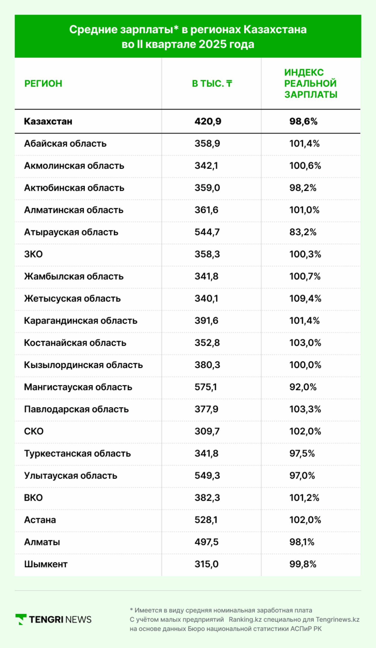 قمنا أيضًا بتصنيف مناطق كازاخستان حسب حجم الأجور بناءً على بيانات مكتب الإحصاء الوطني لجمهورية كازاخستان (بنس ر ك). دخلت في المراكز الخمسة الأولى المدن والمناطق التي تجاوز فيها متوسط الأجر الاسمي المتوسط الوطني (420.9 ألف تنغي).