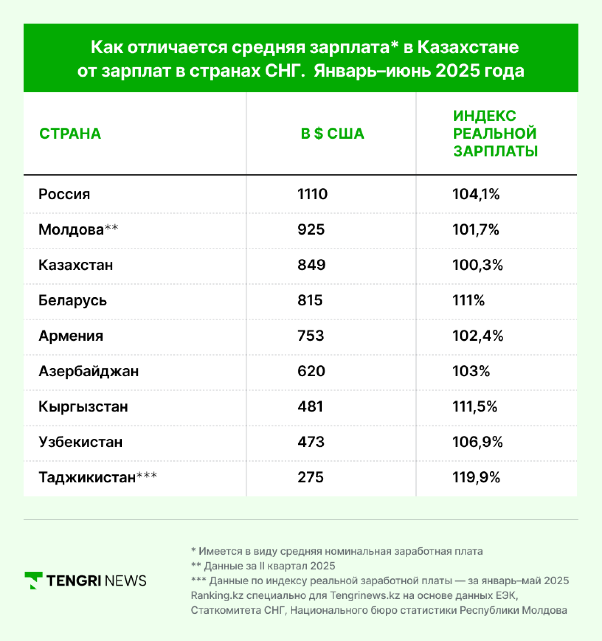 كانت الرواتب أعلى في النصف الأول من عام 2025 فقط في مولدوفا (925 دولارًا) وروسيا (1.1 ألف دولار). وتمكنت بيلاروسيا (815) وأرمينيا (753) أيضًا من تحقيق أرقام مرتفعة. وتخلفت جميع الدول الأخرى في رابطة الدول المستقلة بشكل كبير عن القادة.