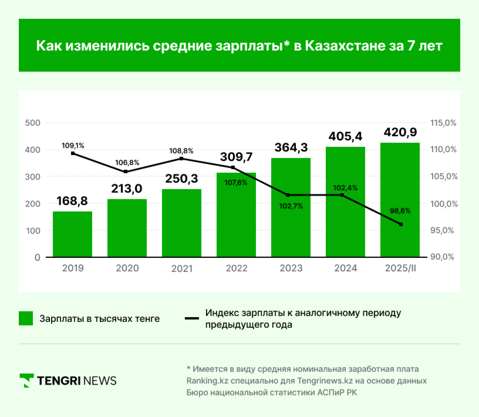 إذن، ارتفع متوسط الأجر الاسمي بنسبة 9.8 بالمئة خلال العام، ليصل إلى 420.9 ألف تنغي.