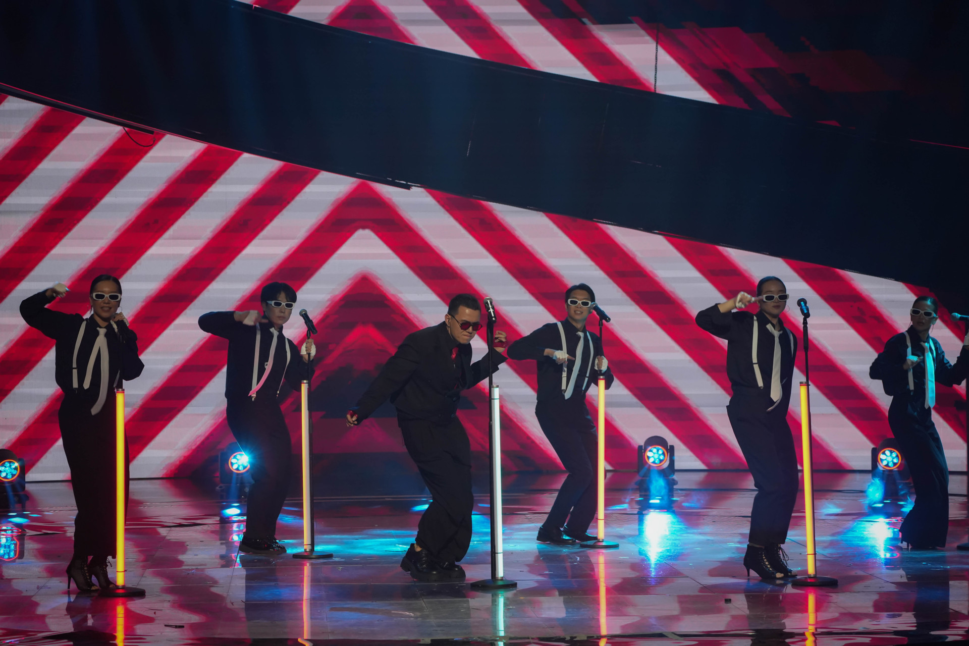 وها هو بنفسه – للحلقة الثانية من العرض اختار مظهرًا باللون الأسود الكامل. ساعده الراقصون في حمالات بيضاء.