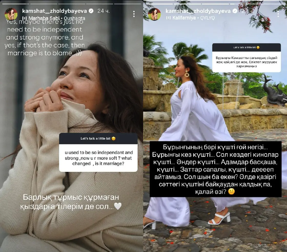 أجرت المغنية الكازاخية كامشات جولديباييفا، العضو السابق في فرقة KeshYOU، حوارًا قصيرًا مع متابعيها عبر خاصية «سؤال وجواب» على إنستغرام، حيث سألها جمهورها عن سبب تغير شخصيتها بعد الزواج، إذ بدت أكثر هدوءًا وليونة رغم أنها عُرفت سابقًا باستقلاليتها وقوتها.