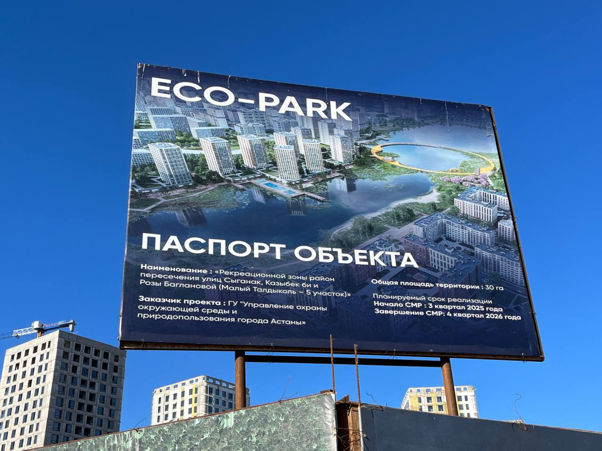 في عام 2023، أعلن العمدة جينيس كاسيمبيك أنهم يدرسون خصائص التربة في الموقع، وفي عام 2024 – أنه يتم إدخال تعديلات على المشروع، وبحلول نهاية نفس العام – أنسيكون الإيكوبارك في أستانا جاهزًا بنسبة 70 في المئة في عام 2025..